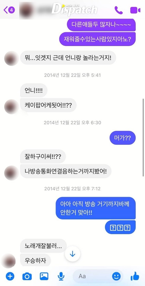 -ⓕ씨 : A씨를 안다. 혜수를 만나러 대치동에 갔다가 A씨를 소개받았다. 사이좋게 밥을 먹었던 기억이 있다. 'K팝스타' 때도 (A씨가) 혜수와 연락을 주고받았던 걸로 알고 있다. 지금 왜 이러는지 모르겠다.