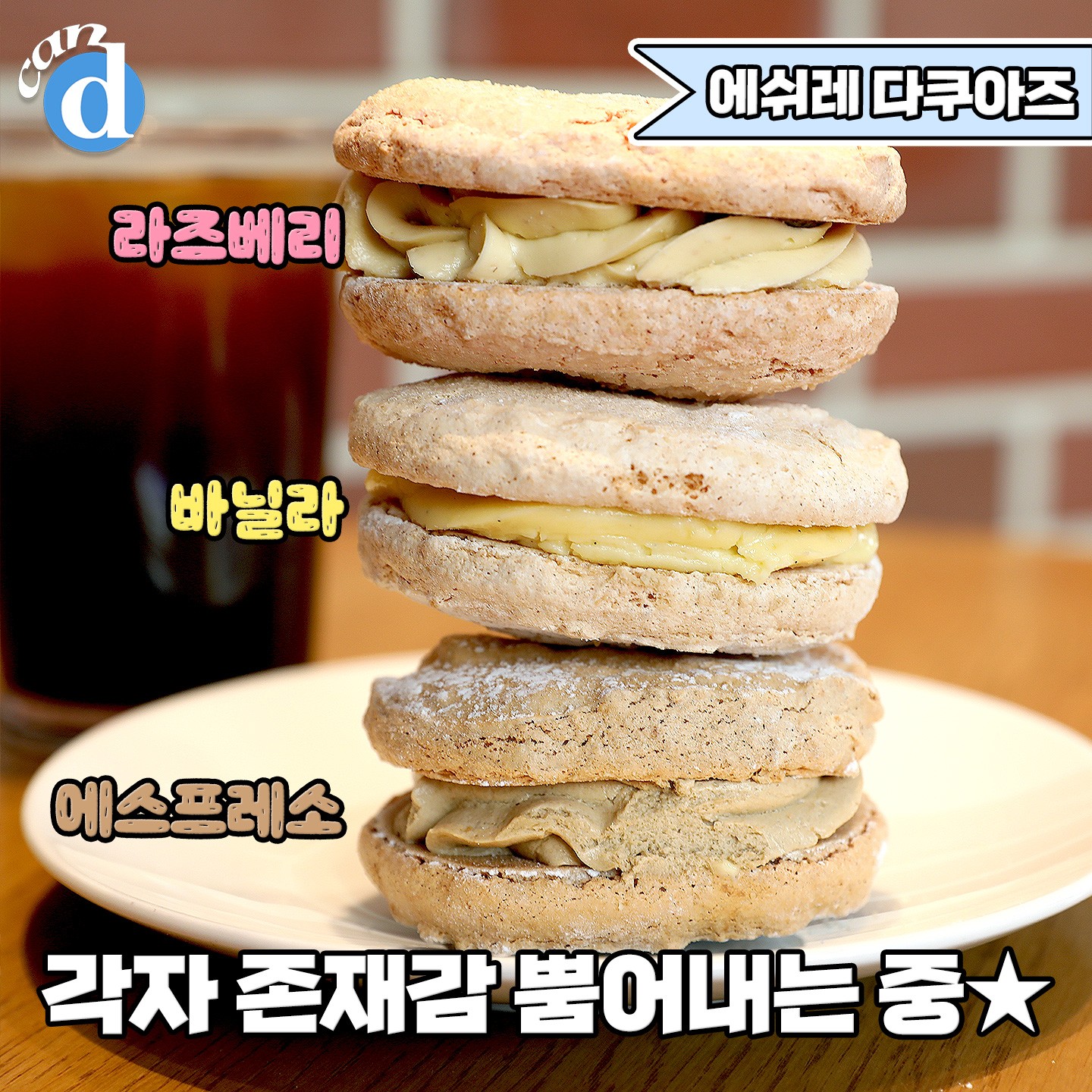 다쿠아즈 러버들 여기 모이세요. 라즈베리, 바닐라, 에스프레소 3가지 맛으로 모십니다★ 진한 필링을 가득 채워 각자 존재감을 뿜어내네요.