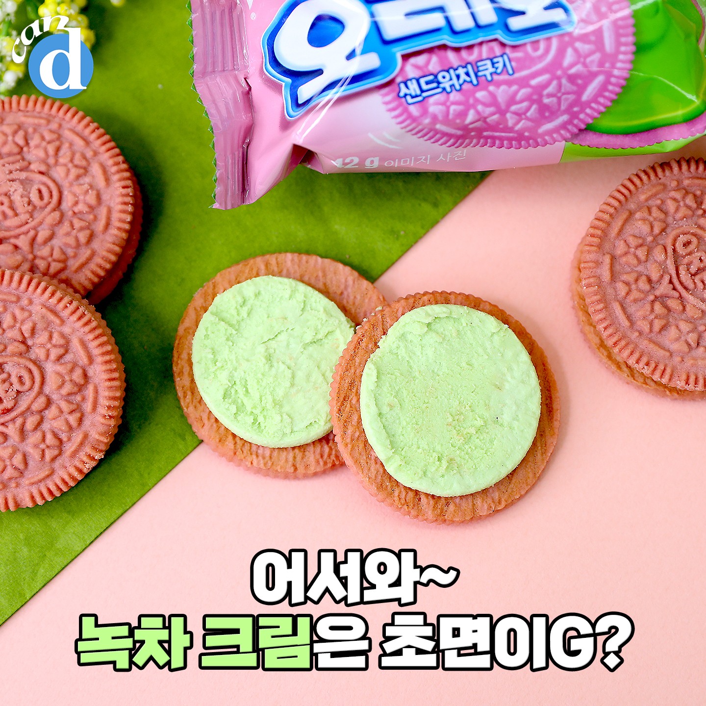 우리가 놀랄 점은 쿠키뿐만이 아니에요. 오레오가 처음으로 선보이는 녹차 크림도 놓칠 수 없어요! 핑크와 그린이라니, 오레오 봄 콘셉트에 진심이네 진심이야!