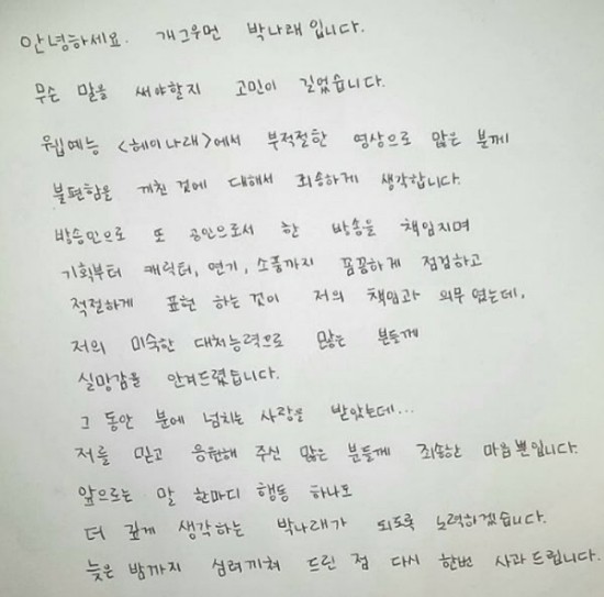 박나래는 25일 개인 SNS에 자필 사과문을 올렸다. "무슨 말을 써야 할지 고민이 길었다. '헤이나래'에서 부적절한 영상으로 불편함을 끼쳐 죄송하다"며 말문을 열었다.