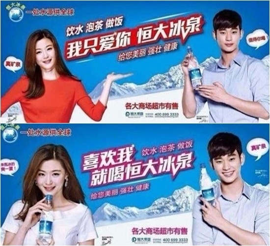 두 사람은 중국 CF에 얼굴을 내밀었다. 그들이 커플로 등장한 광고는 ‘헝다빙촨’ 생수. 생수병에는 <장백산천연광천수>라는 홍보 문구가 적혀 있었다.