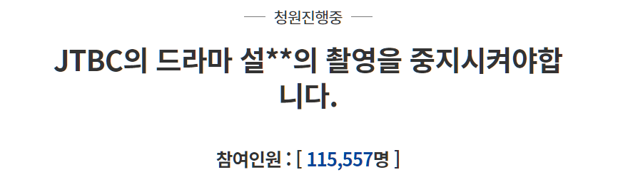 청와대 국민청원 게시판에는 지난 26일 'JTBC의 드라마 설**의 촬영을 중지시켜야 합니다'라는 글이 올라왔습니다. 29일 현재까지도 진행 중인 청원인데요.