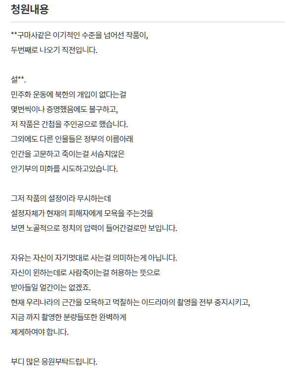 그는 "민주화 운동에 북한의 개입이 없다는 걸 몇 번씩이나 증명했음에도 불구하고, 저 작품은 간첩을 주인공으로 했다"고 설명했습니다. 또한 안기부를 미화해 작품 설정이라고 하기엔 피해자들에게 모욕적이라는 것.