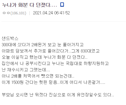 이 유저는 "오늘 이실직고를 했는데, 누나가 화분을 다 던졌다"며 "2배를 먹었으면 뺐으면 되는 건데.. 이게 1500원을 간다는 헛된 믿음, 이게 어디서 나온 걸까.." 라고 자책했습니다.