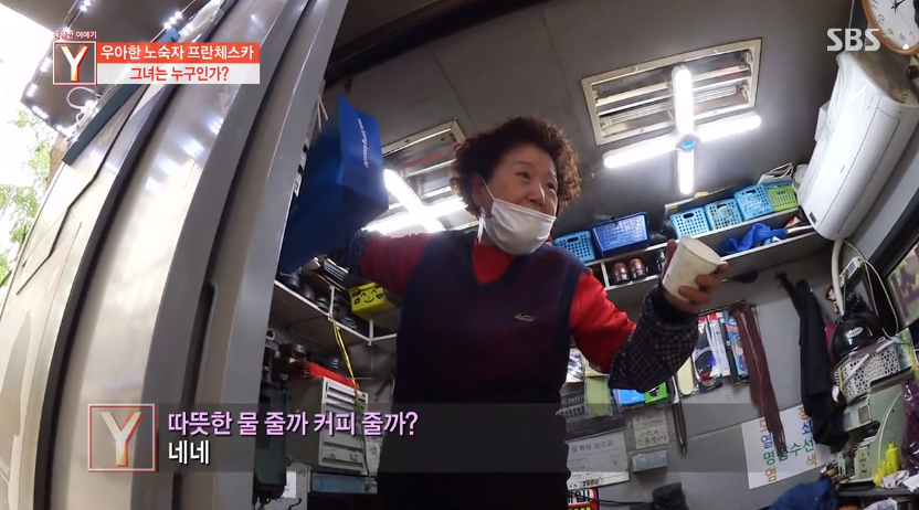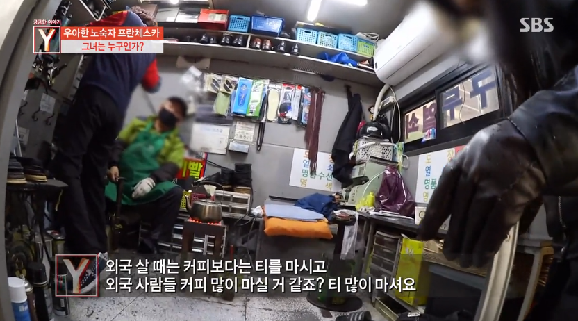 반면 여자는 자신을 "사장님"이라 불러주는 구둣방 사장님께는 온화한 태도를 보였습니다. 구둣방 사장님은 그녀에게 녹차를 권유했는데요. 연신 고마움을 표하며 자리를 뜹니다.