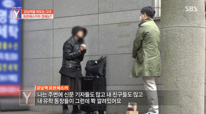 지난 4일 방송된 SBS-TV '궁금한이야기Y'. 강남역 일대의 명물(?)이라는 '강남역 프란체스카'의 사연을 다뤘습니다. 머리부터 발끝까지 올블랙 패션을 입고, 검정색 트렁크까지 끌고 다닌다는 여자.