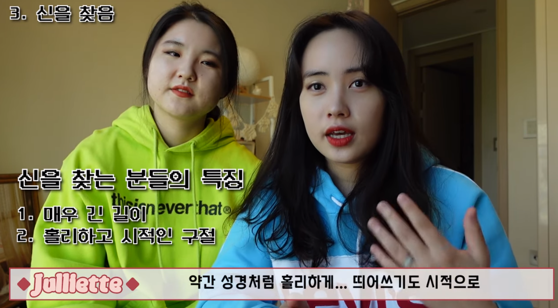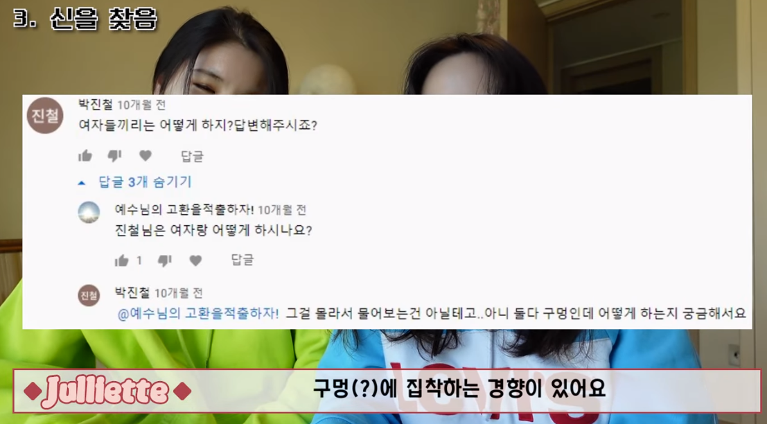 또, 신을 찾는 댓글들. 줄리엣 커플은 "2줄에 들어갈 것도 12줄로 늘린다. 성경처럼 홀리하게 쓰는 댓글들이다"며 사례를 하나 읽었습니다. 성경 구절을 인용해 타박한다는 것.