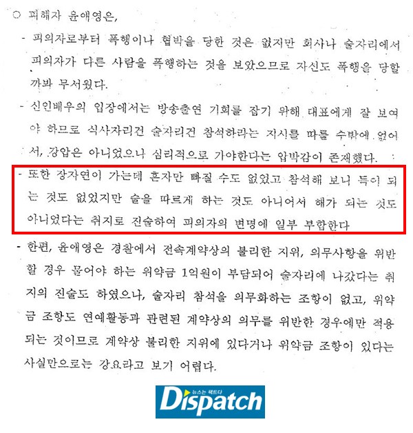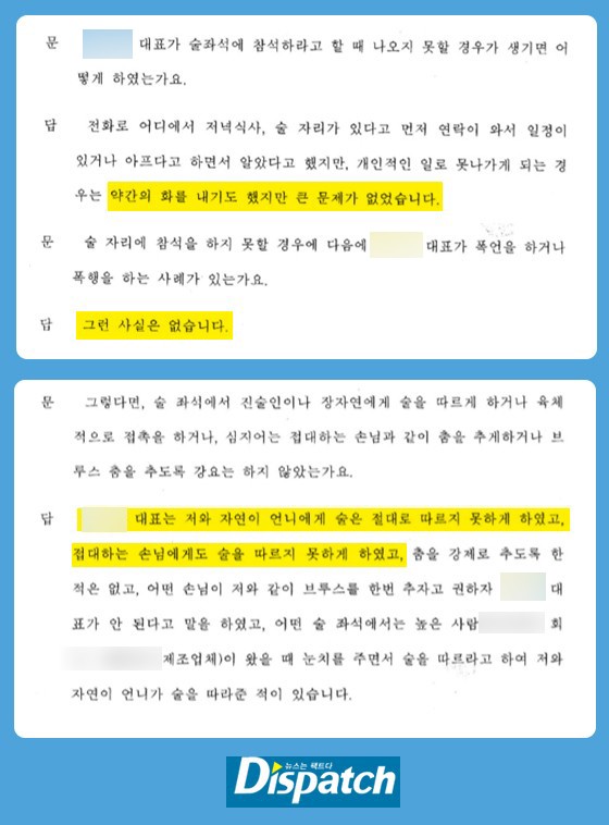 수사기관에서는 "일주일에 많게는 4일, 적게는 2일 K씨으로부터 연락을 받고 술접대를 했다", "매니저, 비서, 코디, 실장 등이 대표 K씨에게 맞았다" 등 진술을 이어나갔다.