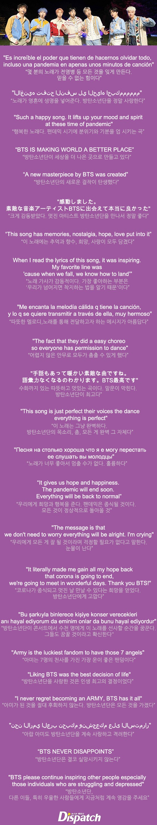 "It literally made me gain all my hope back that corona is going to end, we're going to meet in wonderful days. Thank you BTS!"(코로나가 종식되고 멋진 날 만날 수 있다는 희망을 얻었다. 방탄소년단에게 고맙다)