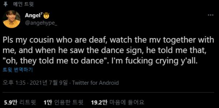 실제로 한 해외 팬은 이날 트위터에 사촌동생과 '퍼미션 투 댄스' 뮤비를 감상한 후기를 올렸다. 이 팬의 사촌동생은 청각장애를 앓고 있었다.