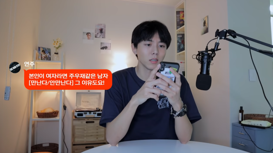 첫 질문, 자신이 여자라면 주우재를 만날 것인지 입니다. 주우재는 "예전의 저였다면 안 만날 것이다. 그때는 배려나 포용력이 많지 않았다"면서도 "지금의 저라면 미칠 것 같다. 만나고 싶어서"라고 능청스레 말했습니다.