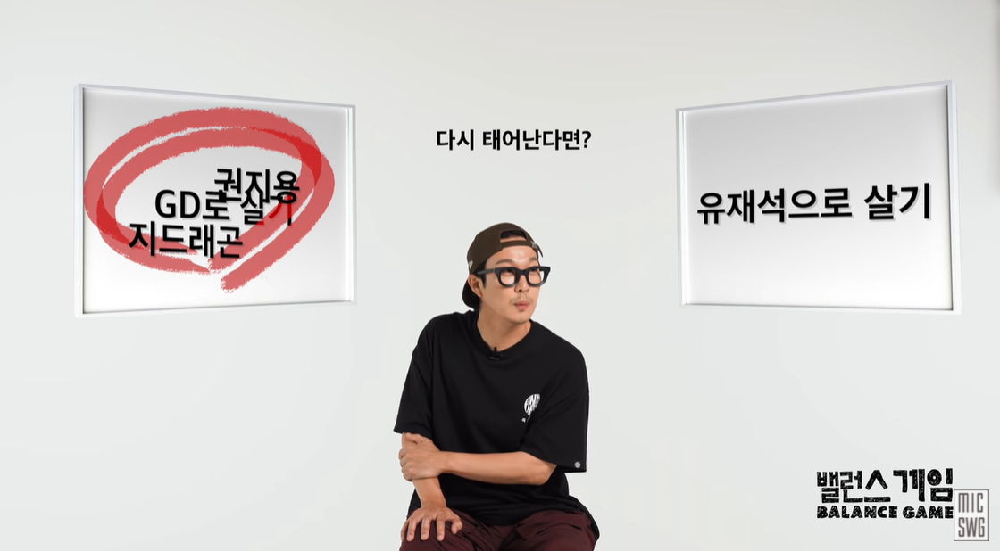 하하는 "다시 태어난다면 GD로 살기 vs 유재석으로 살기"라는 질문을 받았습니다. 그는 고민 없이 'GD로 살기'를 골랐습니다. "지디, 지 드래곤, 권지용!!" 이라고 재차 강조했습니다.