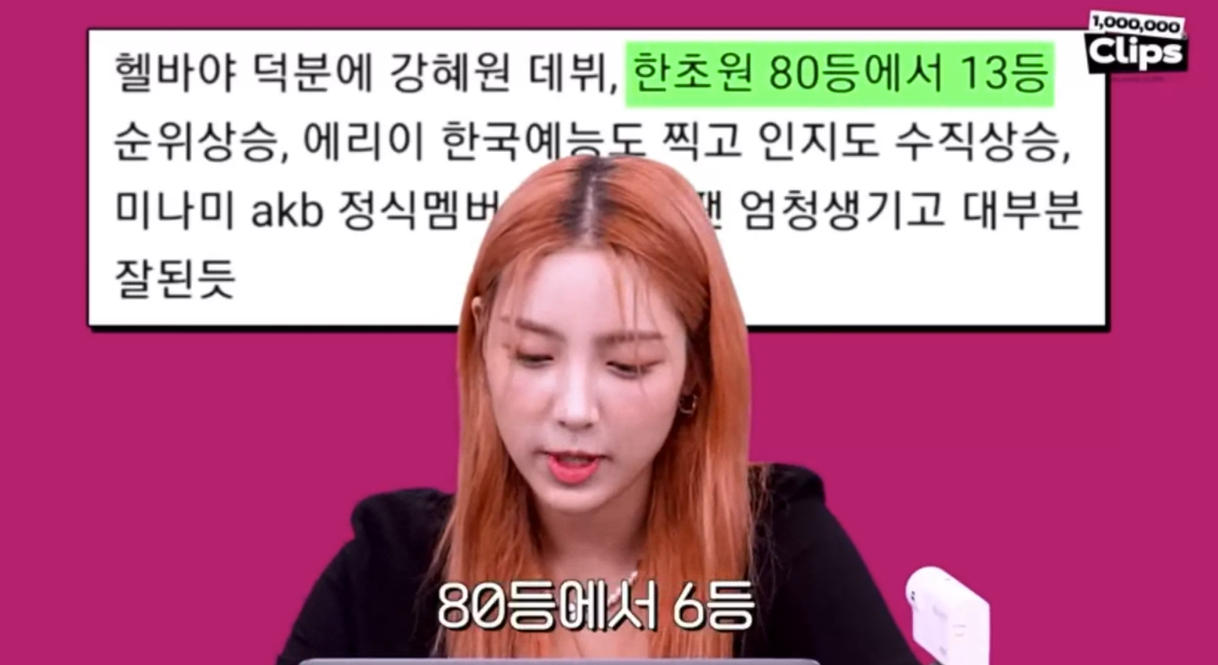 눈길을 끈 것은, ‘프로듀스48’ 순위에 대한 언급이었죠. 한초원은 당시 80등에서 13등으로 최종 데뷔조에서 탈락했습니다.