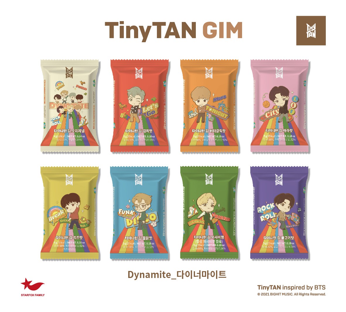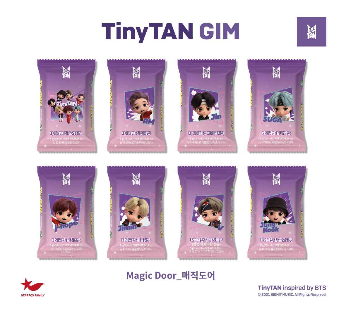 '타이니탄 김'은 '다이너마이트'와 '매직 도어' 등 2가지 버전으로 준비했다. 각 버전은 8가지 맛 패키지로 구성됐다. 김치, 와사비, 불닭, 마라, 불고기, 버터갈릭, 치즈, 오리지널 등이다.