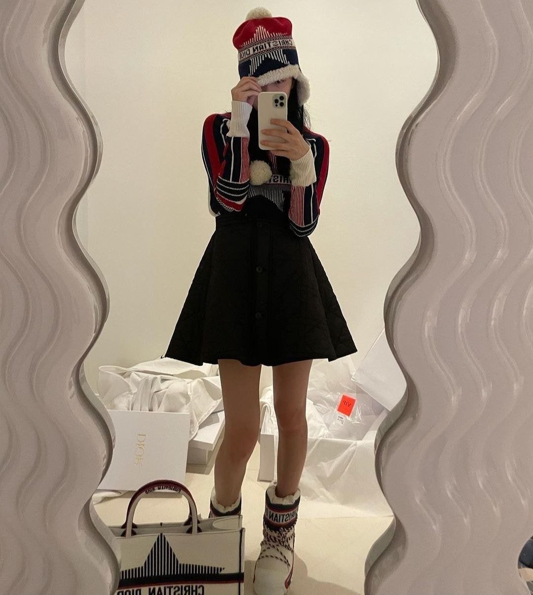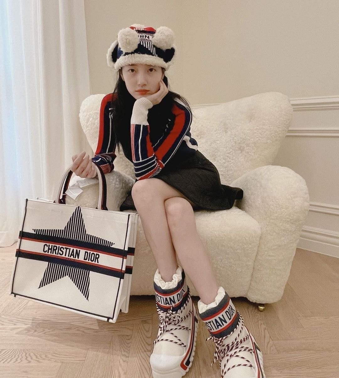 사진에는 디올의 제품을 풀착장한 수지를 볼 수 있었죠. 겨울 느낌 물씬나는 귀여운 패션이었는데요.