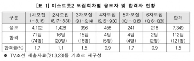 TV조선은 지난해 12월 17일, ‘지원자 총 2만명’이라며 ‘역대 최종 지원자’라는 내용을 홍보했으나, ‘미스트롯2’ 실제 지원자는 7,300여 명이었습니다.