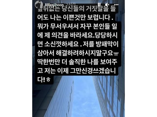이지훈은 7일 자신의 인스타그램에 “앞뒤 없는 당신들의 거짓말을 들어도 나는 예쁜 것 보련다”고 글을 올렸습니다.
