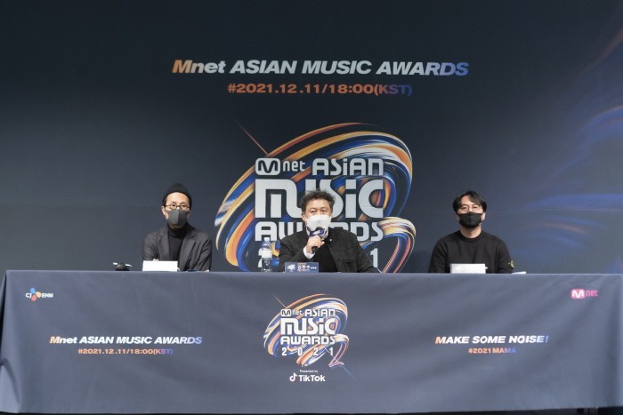 ‘2021 MAMA’ 글로벌 기자간담회가 16일 서울 웨스틴조선호텔에서 온·오프라인으로 열렸다. 김현수 CJ ENM 음악콘텐츠 본부장, 김동현 CJ ENM 컨벤션사업 국장, 박찬욱 엠넷 CP 등이 참석했다.