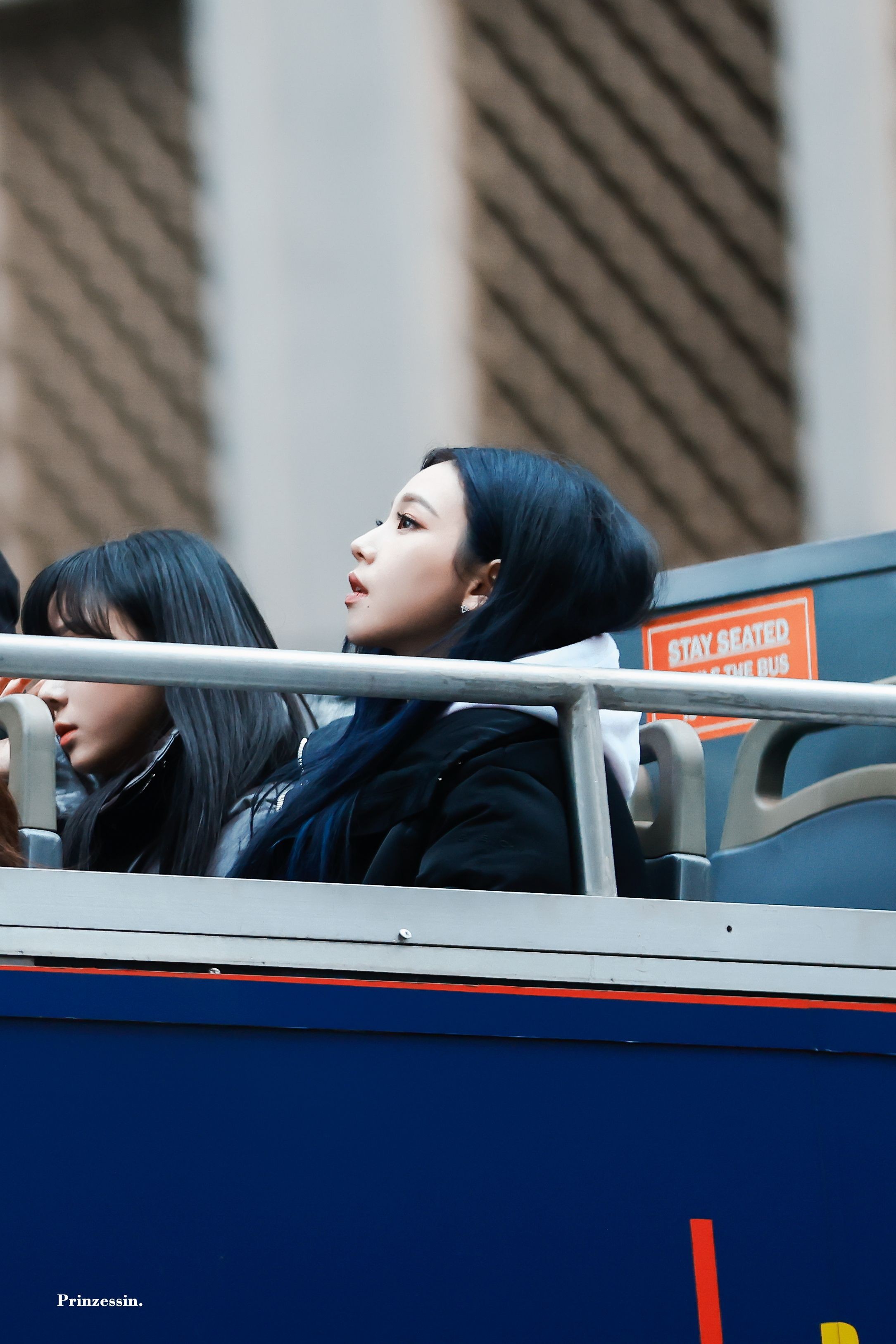 뉴욕 명물인 2층 관광 버스를 탄 모습도 이목을 끌었는데요. 그는 웨이브 롱 헤어스타일에 후드 티셔츠, 블랙 계열 아우터를 입고 미모를 뽐냈습니다.