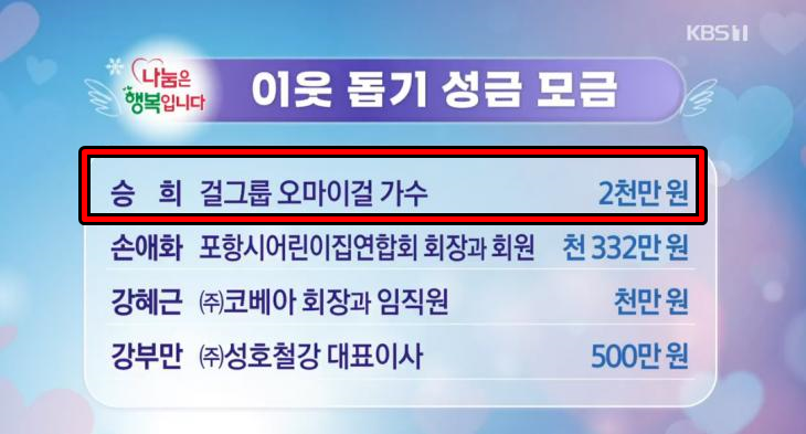 이때 '오마이걸' 승희가 2천만 원을 기부한 것으로 나와 눈길을 끌었죠.