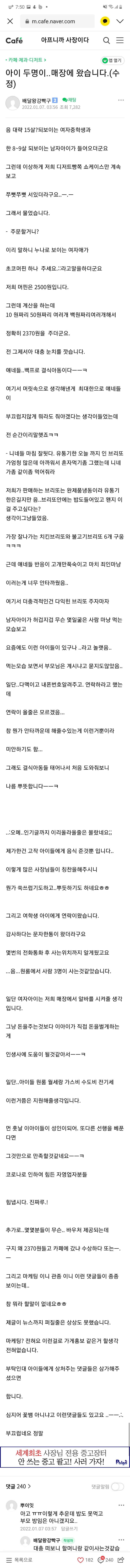카페를 운영하는 A씨는 지난 7일, 네이버 소상공인 커뮤니티 '아프니까 사장이다'에 "아이 두 명이 매장에 왔다"는 제목의 글을 올렸습니다.