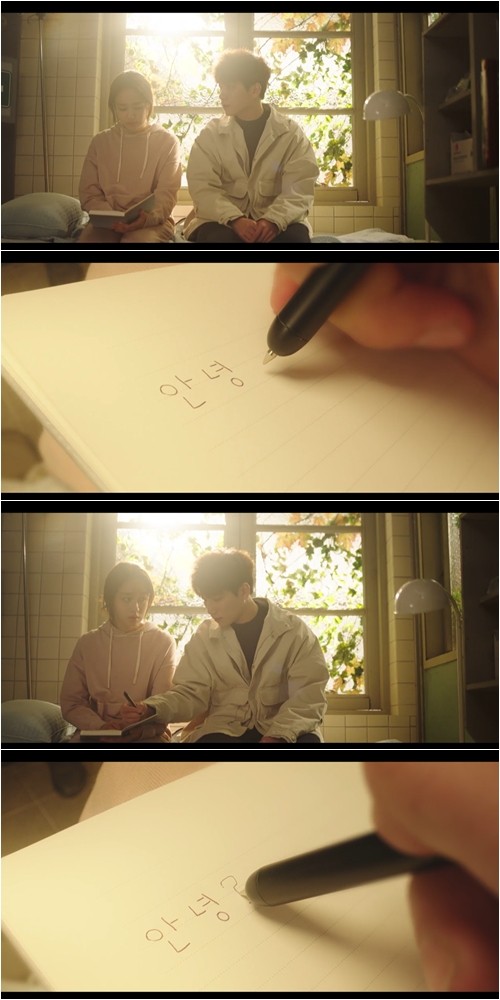 우천은 인숙이 쓴 '안녕.' 뒤에 '?'를 눌러 적는다. 그 후 인숙을 보며 싱긋 웃는다.