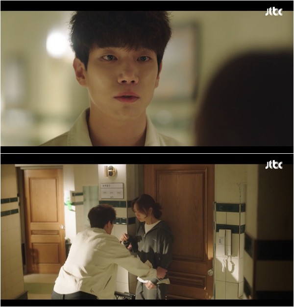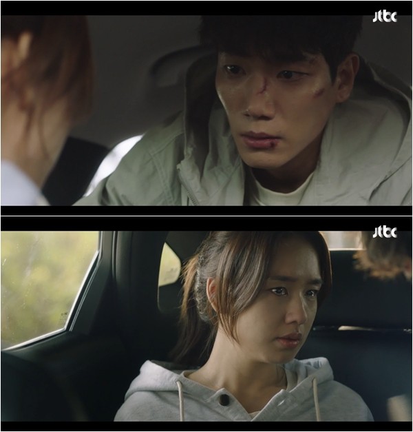 (우천은 밖에 사람이 있다며 인숙의 입을 막는다. 우천은 복부를 다친 상태. 인숙은 반사적으로 밀어내다, 우천이 통증을 느끼는 걸 본다.)
