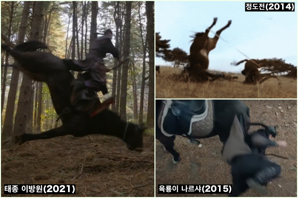 2014년 ‘정도전’ 때도 말의 다리에 줄을 묶었다. 심지어 화면에 줄이 그대로 노출됐다. 그리고 7년이 지났다. 2021년 ‘태종 이방원’에서 그 기법(?)은 다시 쓰였다.