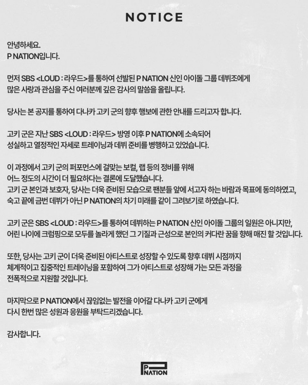 고키는 지난해 ‘라우드’에서 데뷔조로 발탁, 피네이션에 소속됐다. 트레이닝과 데뷔 준비를 병행하고 있었다. 하지만 최종 데뷔조 합류는 하지 못하게 됐다.