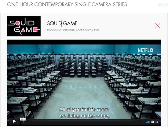 '오징어 게임'은 '1시간 현대극 싱글 카메라 시리즈'(One hour contemporary single-camera series)부문 후보로 지명됐다. 6화 '깐부'편 세트 시설을 높이 평가했다.