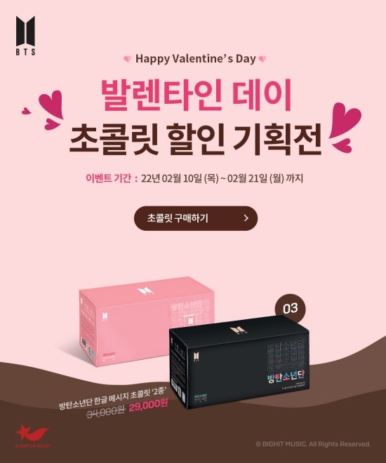 이벤트 제품은 방탄소년단의 한글 메시지를 담은 초콜릿과 멤버들의 캐릭터로 만든 ‘타이니탄 메시지 초콜릿’ 버전 1·2다.