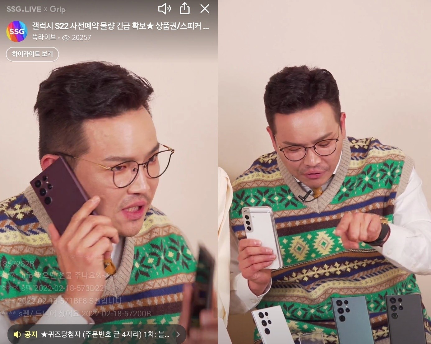 그는 같은 날 SSG닷컴에서 진행된 삼성 갤럭시 S22 사전예약 판매에 나섰습니다. 여성 쇼호스트와 '쓱라이브' 방송에 임했습니다.
