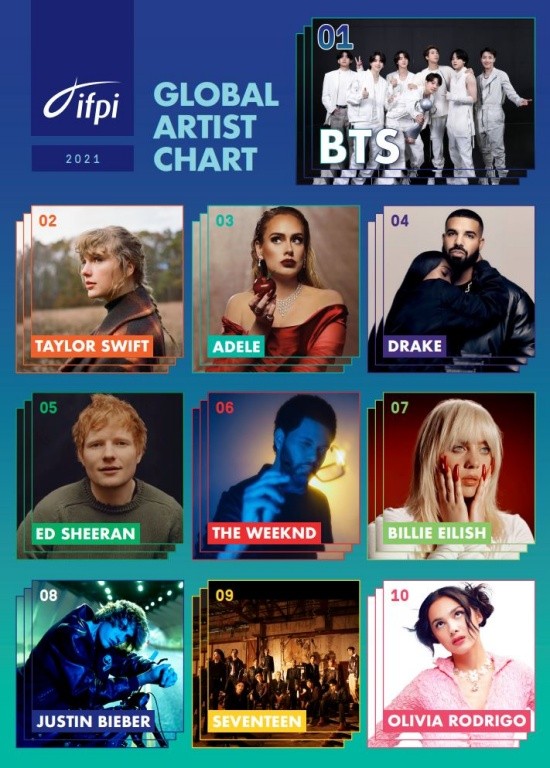 ‘IFPI’ 측은 25일 공식 홈페이지와 SNS 등에 “BTS가 ‘글로벌 아티스트 차트 2021’에서 1위에 이름을 올렸다”고 발표했다.