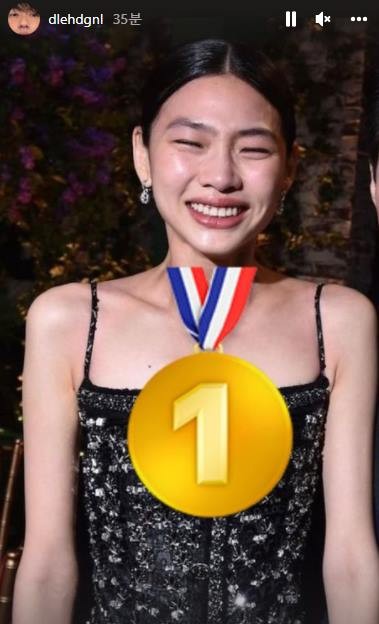특히 이동휘는 숫자 1이 적힌 커다란 금메달 스티커를 정호연 목에 걸어 수상을 축하며 애정을 과시했습니다.