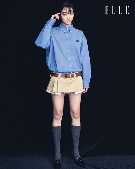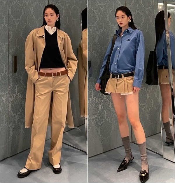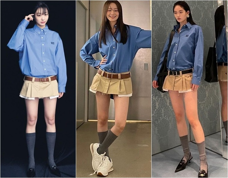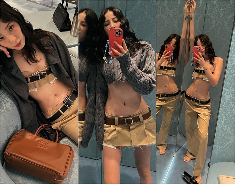 로우 라이즈가 부담스럽다면? 크롭 대신 골반을 커버하는 상의를 고르면 된다. 김다미, 신현지, 윤아처럼 셔츠를 스커트 안으로 넣어 입으면 투머치 노출을 피할 수 있다.
