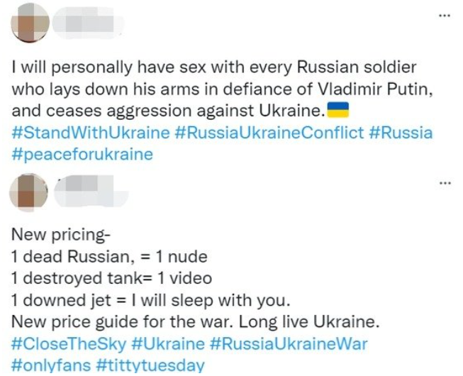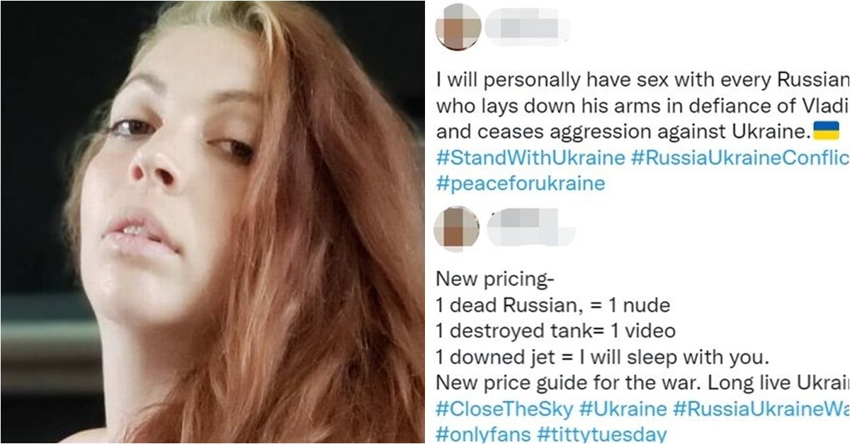 그는 "러시아인 한 명 죽으면 나체 사진 한 장, 파괴된 탱크 한 대에 야한 영상 한 개, 제트기 한 대 추락하면 성관계를 해줄 것"이라며 "전쟁을 위한 새로운 가격표다. 우크라이나 만세"라고 적었다.