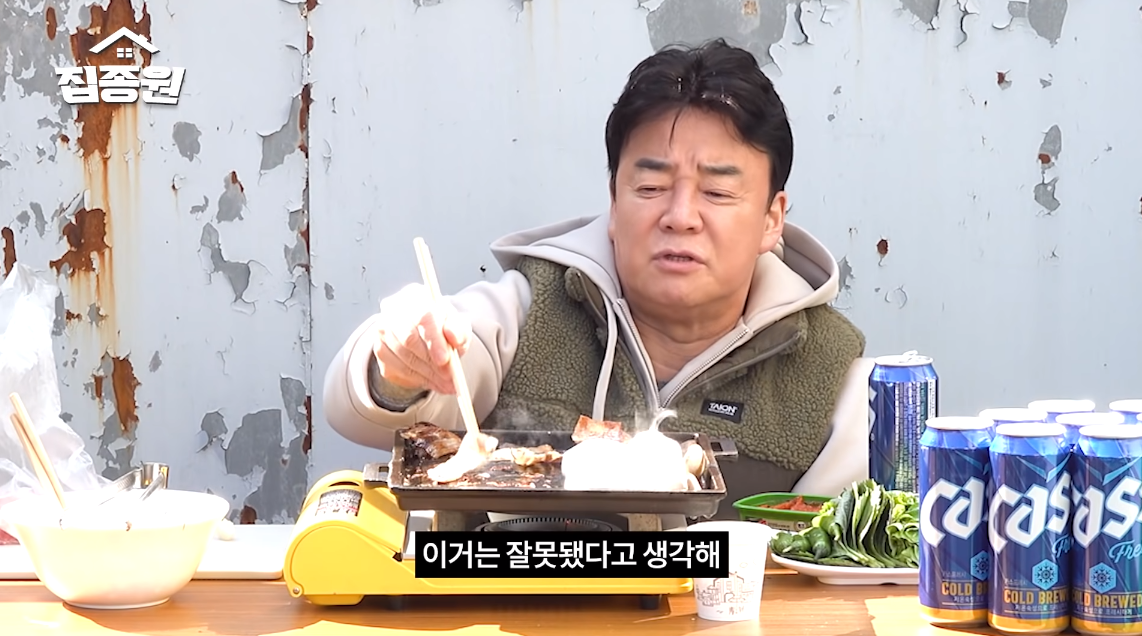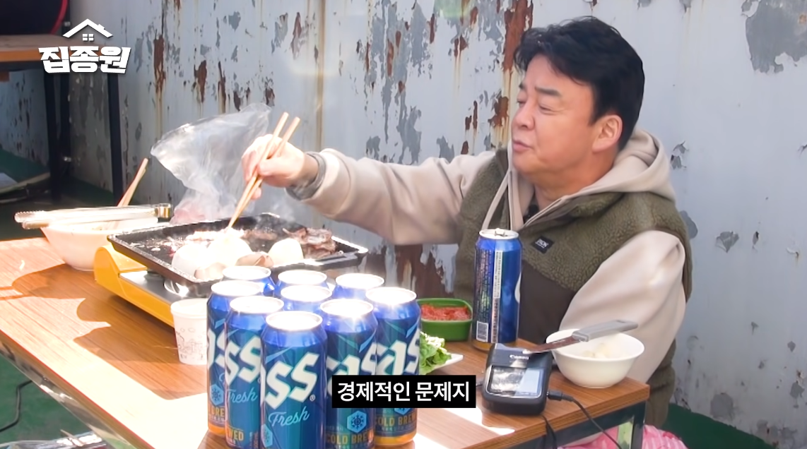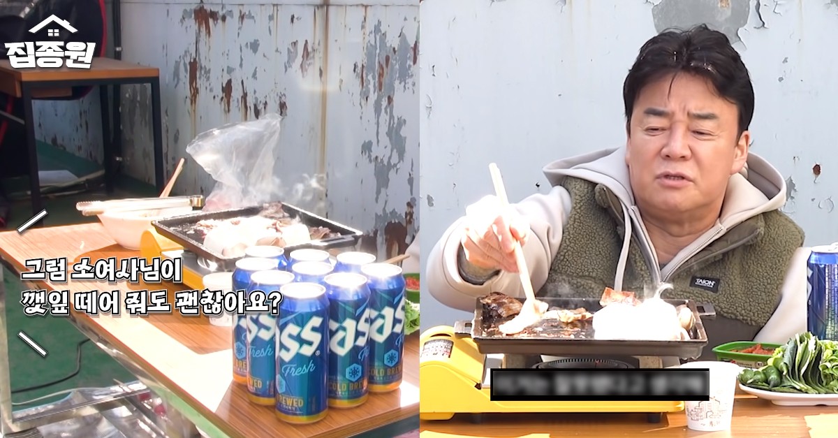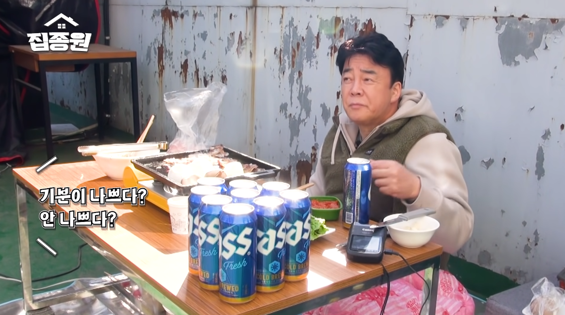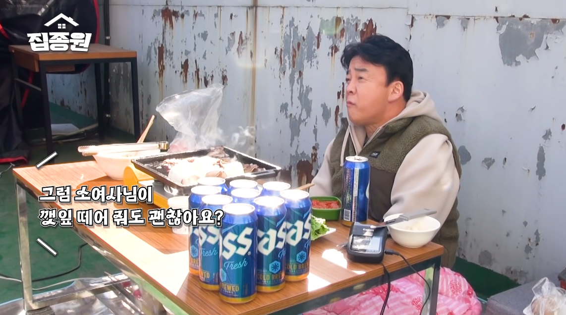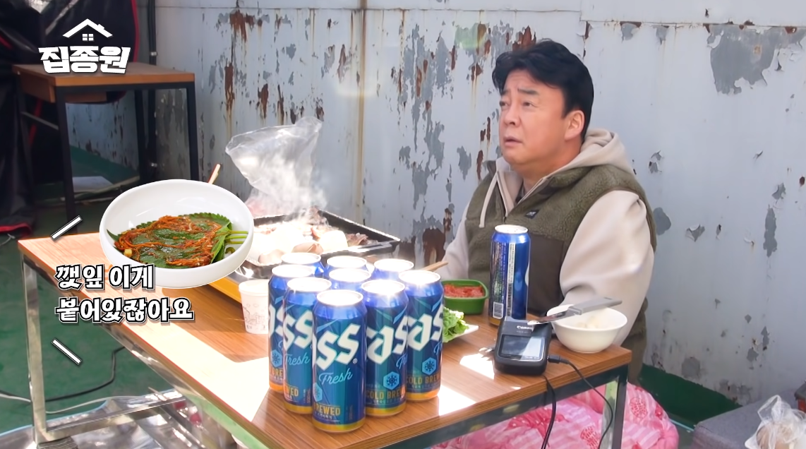 백종원은 삼겹살, 깻잎, 상추, 버섯, 김치 등을 준비했죠. 맥주까지 완벽하게 세팅했는데요.