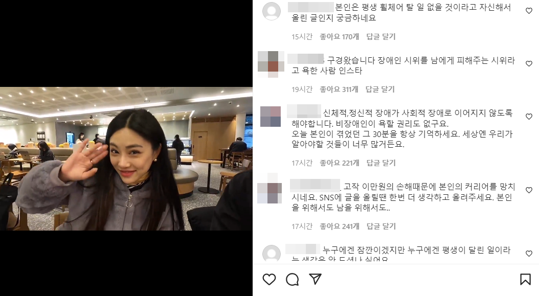 그 외에도 "비장애인들은 늦으면 돈이라도 써서 이동할 수 있다. 하지만 장애인들은 그 기본적인 이동도 어려워서 시위를 하는 것이다. 창피한 줄 알아라", "오늘 본인이 겪었던 그 30분을 항상 기억하라. 세상엔 우리가 알아야 할 것들이 너무 많다" 등 지적이 쏟아졌습니다.
