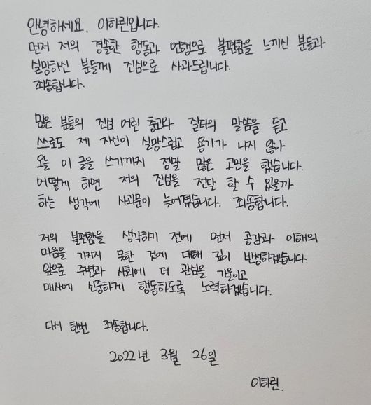이하린은 비판이 계속되자, 26일 사과문을 올렸는데요. "많은 분들의 진심 어린 충고와 질타의 말씀을 듣고, 스스로 제 자신이 실망스럽고 용기가 나지 않아 오늘 이 글을 쓰기까지 정말 많은 고민을 했다"고 솔직히 말했습니다.