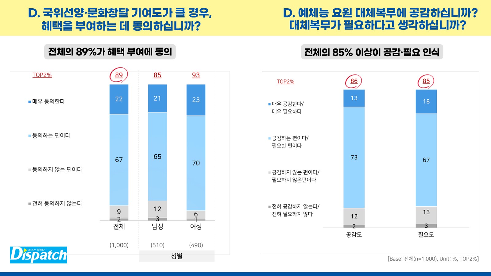 '디스패치'가 <병역특례에 관한 대국민 인식조사>를 실시했다. 여론조사전문회사 '엠브레인'에 의뢰, 14~59세 국민을 상대로 예술·체육요원 제도 전반에 관해 물었다. (신뢰수준 95%. 오차범위 ± 3.1%)