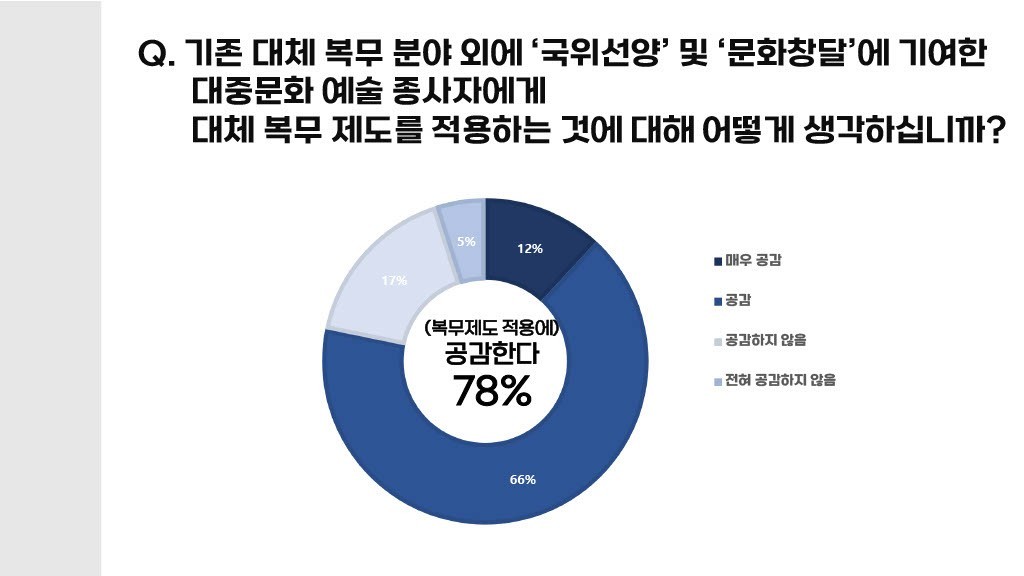 <대중문화 예술인의 대체복무 제도 편입>에 대한 공감률도 전체 78%에 달했다. "경제적 파급효과(43%)", "시기가 중요한 분야라서(43%)", "국가위상을 높여야 해서(41%)" 등 이유도 다양했다.