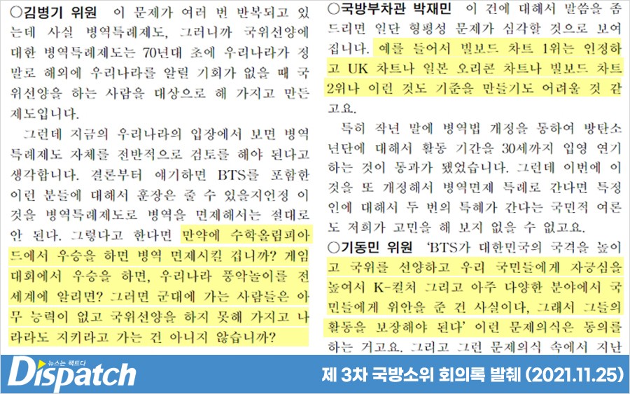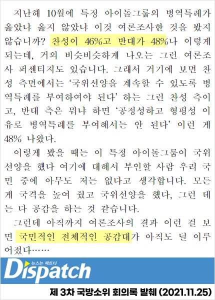 [Dispatch | 김지호·박혜진기자] 기동민 의원 : BTS가 국위를 선양하고, 국민 자긍심을 높인 것이 사실입니다. 그들의 활동을 보장해야 한다는 문제의식에 동의합니다.