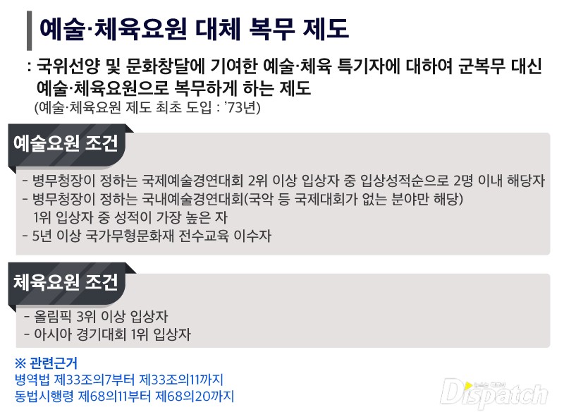 병역법 제 33조의 8 제1항은 "국위선양과 문화창달에 이바지한 예술 체육인은 2년 10개월 동안의 대체복무를 통해 해당 분야 발전에 기여하도록 한다"며 병역특례를 유지하고 있다.