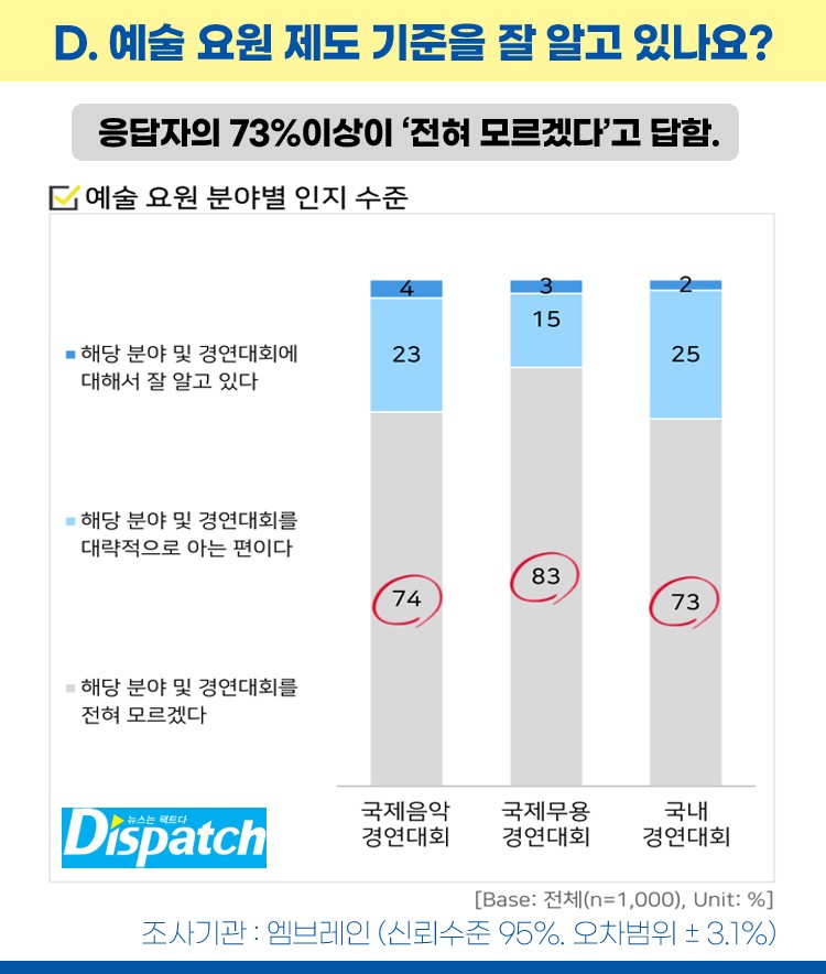 응답자의 평균 76%가 예술 요원 편입 대회를 "모른다"고 답했다. 편입 대회에 대한 인지 수준이 매우 낮은 것으로 드러났다. "현재 기준이 적합하다"(66%)는 의견보다, "기준 개선이 필요하다"(70%)는 응답이 더 많았다.