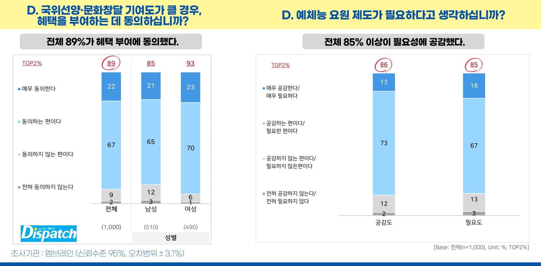 -> 응답자의 89%가 국위선양 및 문화창달 기여도에 따른 혜택 부여에 동의한다고 말했다.