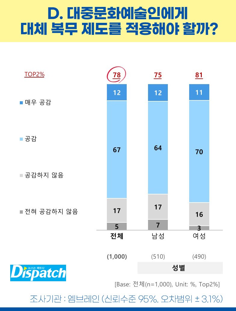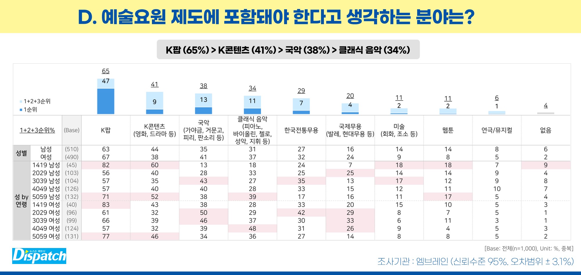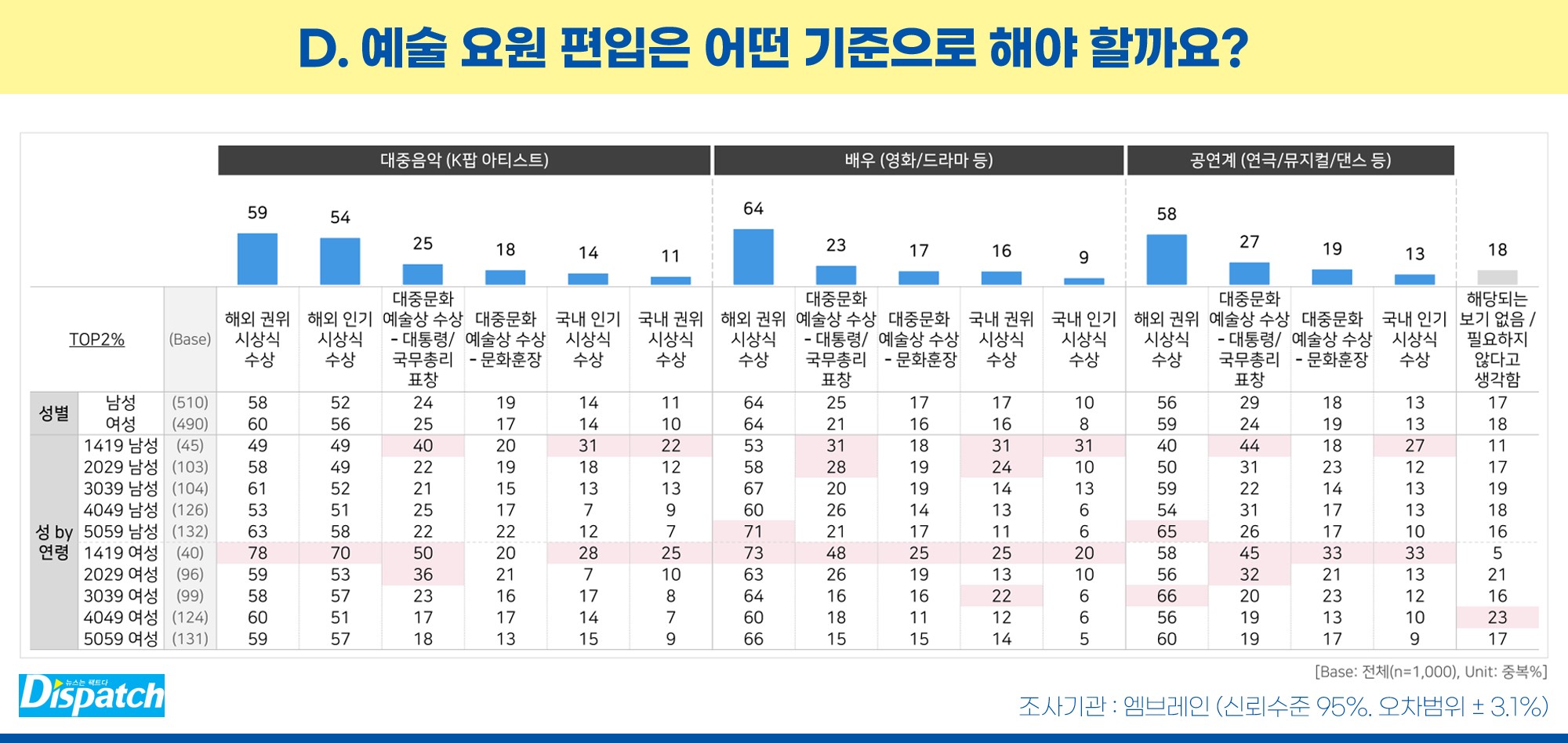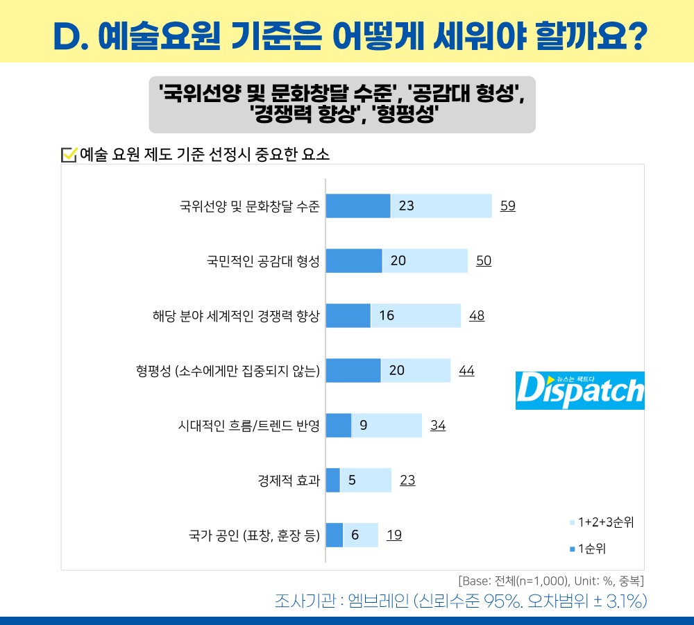 '디스패치'가 <병역특례에 관한 대국민 인식조사>를 실시했다. 여론조사전문회사 '엠브레인'에 의뢰, 전국 만 14~59세를 대상으로 예술·체육요원 제도에 관해 물었다. (신뢰수준 95%. 오차범위 ± 3.1%)