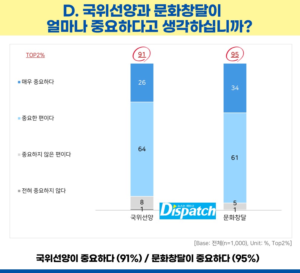 -> 응답자의 91%는 국위선양이 중요하다고 답했다. 95%는 문화창달이 중요하다고 말했다.