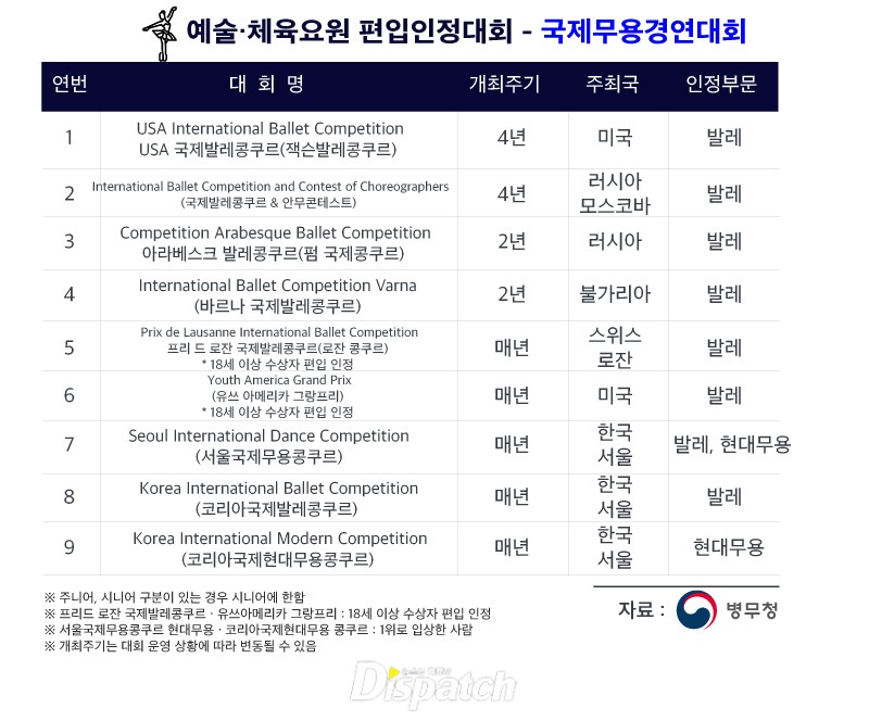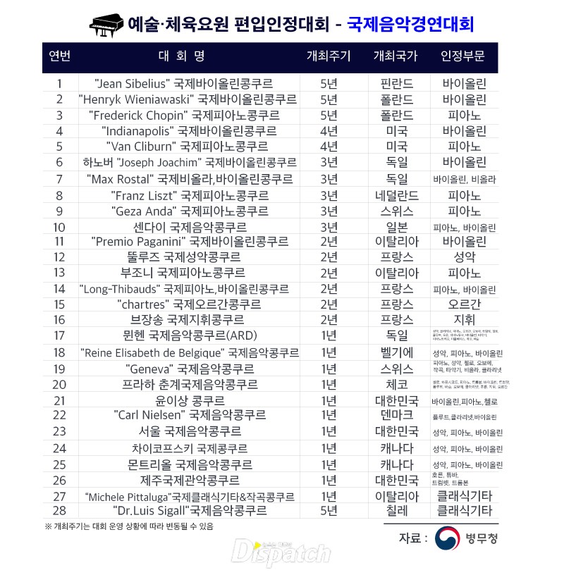 그도 그럴 것이, 병무청은 (유네스코가 인정한) 28개 국제음악콩쿠르, 9개 국제무용콩쿠르, 그리고 5개 국내경연대회(국제대회가 없는 분야) 등 총 42개 콩쿠르를 예술요원 편입대회로 인정하고 있다.