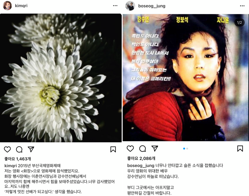 안연홍도 '여인천하'에서 만났던 강수연의 인품을 기억한다. 그는 "저처럼 새카만 후배도 항상 따뜻하게 챙겨 주셨던 언니, 언니와 카메라 앞에서 연기했던 건 언제나 저의 자랑거리 중 제일 첫 번째였다"고 그리움을 전했다.