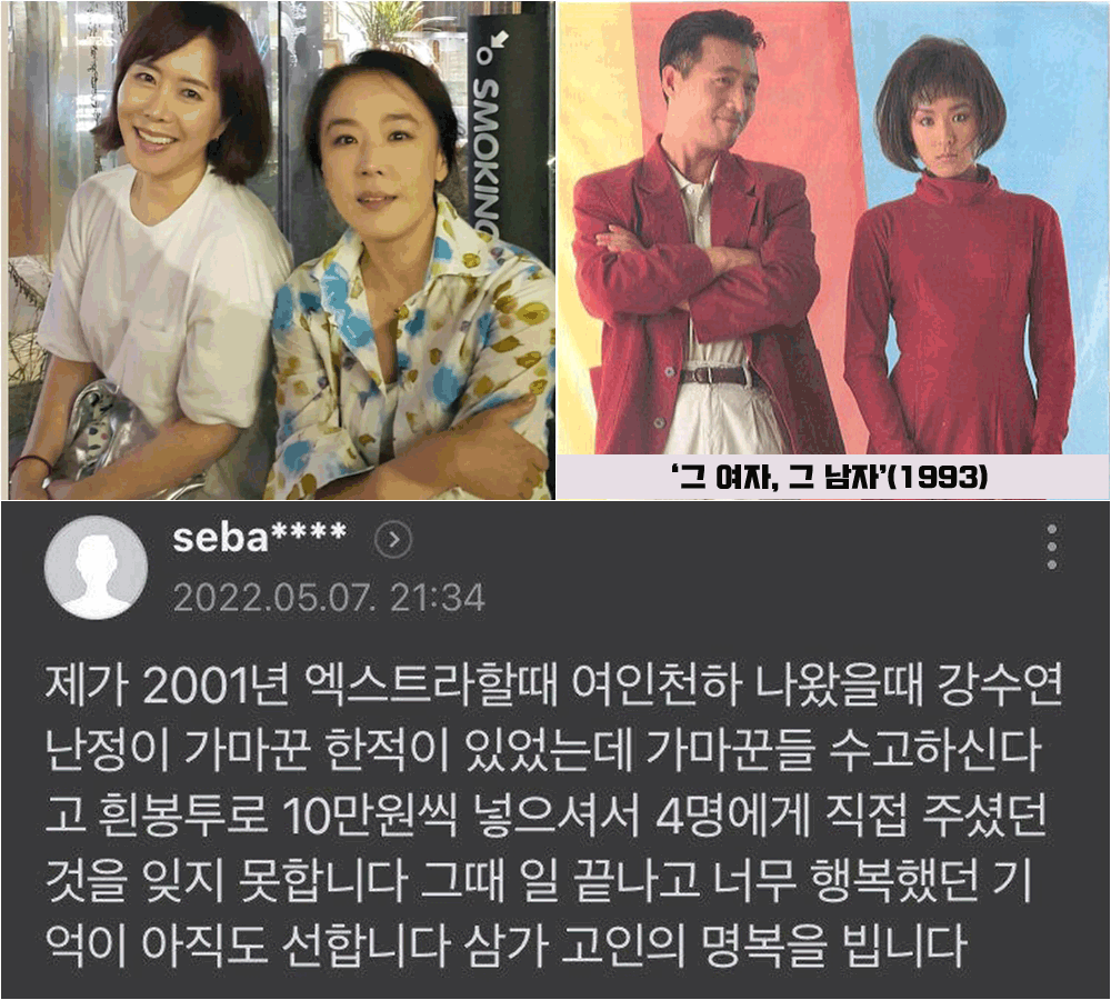 "그녀가 종종 와 술을 마시던 식당이 장마로 물이 차 보일러가 고장났다. 주인이 넋을 놓고 앉아 있는데, 강수연이 연유를 묻고는 그 자리에서 바로 수리비 600만 원을 헌사했다. 듣기론 그녀도 당시 넉넉치 않은 사정에 온 가족을 부양하고 있었다는데…." (윤영미 아나운서)